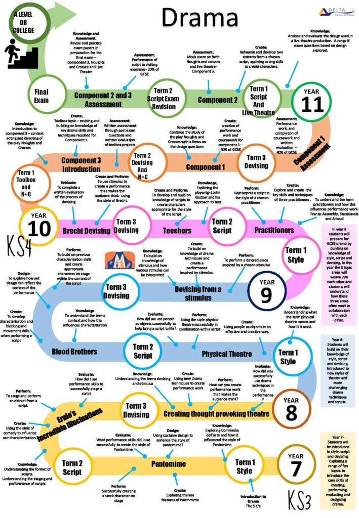 The curriculum for students in Years 7, 8 and 9 is based on three core elements of drama: style, script and devising. Each year they build on their knowledge and understanding of these elements preparing them for both GCSE and A level drama. This curriculum also prepares students for future learning and the world outside of education with transferable skills such as communication and collaboration