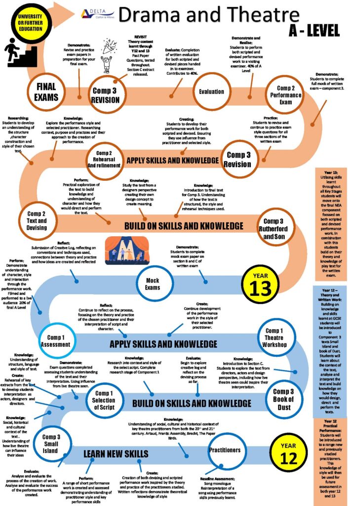 At Key Stage 5 Sixth Formers studying A Level Drama and Theatre Studies follow the Eduqas specification which is broken into three components – Theatre Workshop; Text in Action and Text in Performance. Assessment at the end of two years is through a combination of a final written exam, a scripted performance and devised performance and two pieces of extended written coursework reflecting on the practical process.
