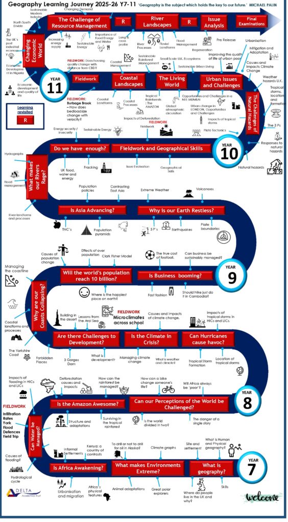 Geography offers the opportunity to study a range of topics that investigate the physical processes of our planet, human societies and the economic and environmental challenges within the local, national and global context. This gives students the confidence to interact with the wider world, leading to fulfilled and positive life experiences. The curriculum encourages students to ask questions, develop critical thinking skills, and layer a deeper understanding of complex concepts as the course navigates through the curriculum.