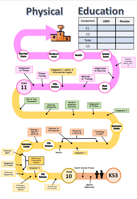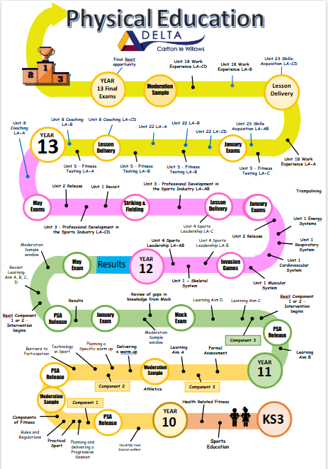 Pupils follow content according to the National Curriculum for Physical Education. Which allows pupils to experience a balanced and varied curriculum allowing pupils to participate in a wide variety of activities as well as participating in competitive team and individual activities as well as dance and gymnastics (through Trampolining). Pupils are also taught to use technical terminology with confidence accurately and precisely, building up an extended specialist vocabulary; can apply their mathematical knowledge to their understanding of PE, including measuring, timing, estimating and analysing data. Attend extra-curricular sporting clubs and competitions, have an opportunity to represent their school and community. Develop a lifelong love of sports and physical exercise. Make positive informed choices around their health, well-being and diet. Link the benefits of a healthy diet and physical activity to mental and physical well-being. Develop their leadership qualities and skills through sport. Have a sound understanding of different sports, their origins, including British and worldwide sporting role models. Are prepared to transition from Key Stage 3 to Key Stage 4 with the skills, knowledge, character and leadership to excel in Key Stage 4. Promoting underlying themes/components of BTEC Tech in Sport qualification.
