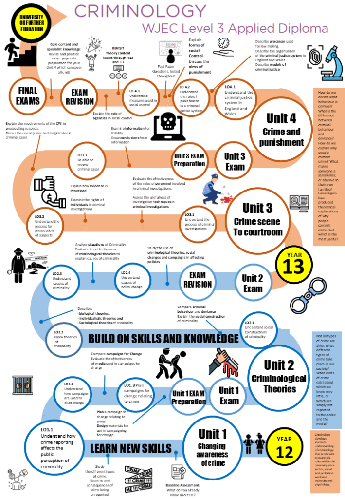 | * skills required for independent learning and development * a range of generic and transferable skills * the ability to solve problems * the skills of project-based research, development and presentation * the fundamental ability to work alongside other professionals, in a professional environment * the ability to apply learning in vocational contexts | * Throughout the course we refer to current and past popular culture and show the impact of criminal cases on the day to day lives of people. * In Unit 1 students have an opportunity to plan a campaign for change relating to crime reduction. This gives them a chance to see how they could make a change in their day to day life, both within the context of crime and everyday life. * Students are encouraged to attend crown court hearings in Nottingham and relate it to their studies | The main purpose of the WJEC Level 3 Applied Diploma in Criminology is to use the qualification to support access to higher education degree courses, such as: * BSc Criminology * BA Criminology * BA Criminology and Criminal Justice BSc (Hons) * Criminology and Psychology * LLB (Hons) Law with Criminology * BA (Hons) Criminology and Sociology * BA (Hons) Criminology * BSc (Hons) Psychology and Sociology * BSc Criminology with Law Alternatively, the qualification allows learners to gain the required understanding and skills to be able to consider employment within some aspects of the criminal justice system, such as: the National Probation Service, the Courts and Tribunals Service or the National Offender Management Service. |